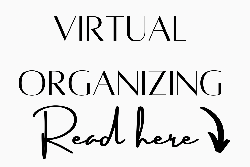If you are interested in VIRTUAL ORGANIZING, please send us a message with the required fields and put “Virtual Organizing” in the message box. Please add any other comments or questions you have also! An invoice will be sent within 2 business days. Once that’s paid, I will contact you and we will get started on the VIRTUAL ORGANIZING process! I am excited to get started and to meet you, virtually of course!
