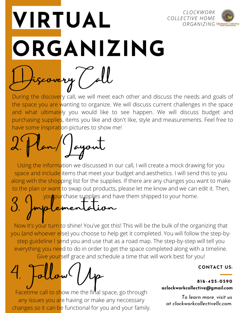 Ideally, virtual organizing is a great option for those who can physically do the work but struggle to see the space from an outside perspective and need ideas and solutions to implement.